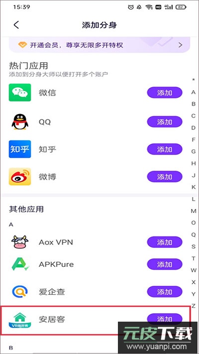 2、在应用列表中选择需要分身的程序;找到目标应用后点击添加。