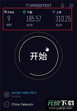 1、打开应用后点击开始按钮,系统将自动检测当前的下载速度、上传速度及网络延迟;