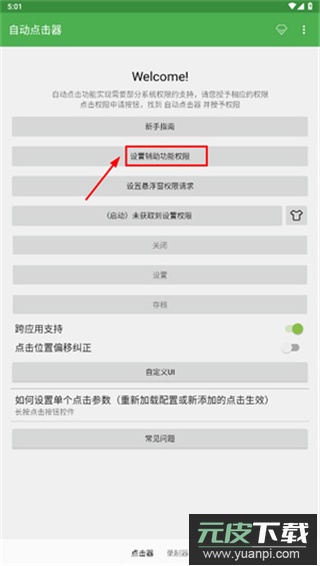 1、首先打开自动连点器app,点击【设置辅助功能权限】;