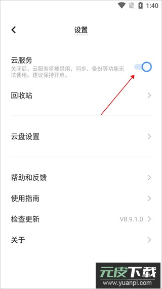 2、进入设置界面后,将云服务功能开关开启;