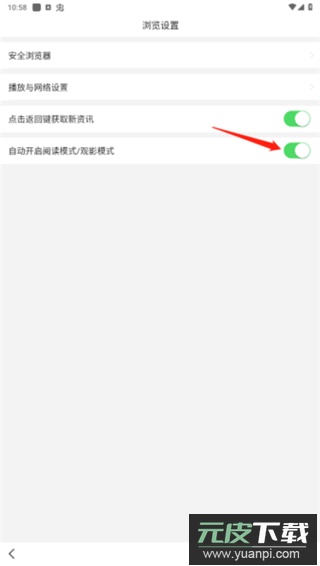 4. 在浏览设置中找到自动阅读模式或观影模式,将其开关打开;