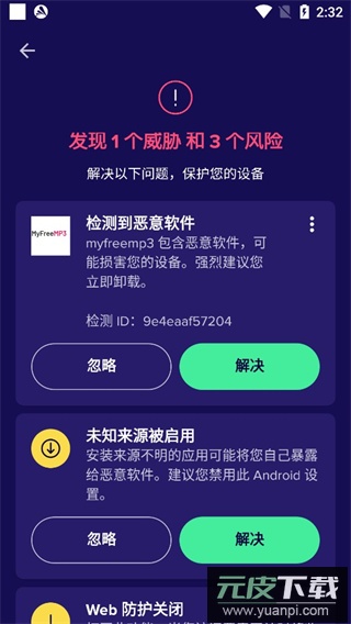 2、防病毒引擎:自动扫描病毒与其他恶意软件,包括间谍软件与木马等。网页、文件及应用程序扫描共同构建完整的移动端保护;