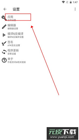 3、进入设置页面后,点击底部的应用选项