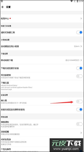 3、在设置中找到“省心装”选项,将其开启即可启用快速安装模式,该功能需要设备已获取Root权限;