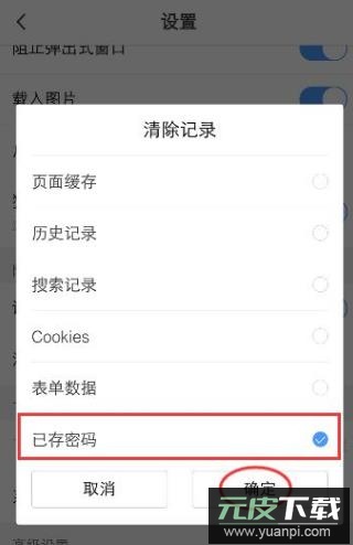在清除记录页面中,勾选【已存密码】选项,然后点击确定按钮。