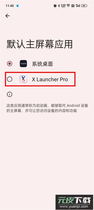 6、系统将跳转至主屏幕应用选择页,选中“x launcher pro”并确认,即可完成默认桌面的设定。