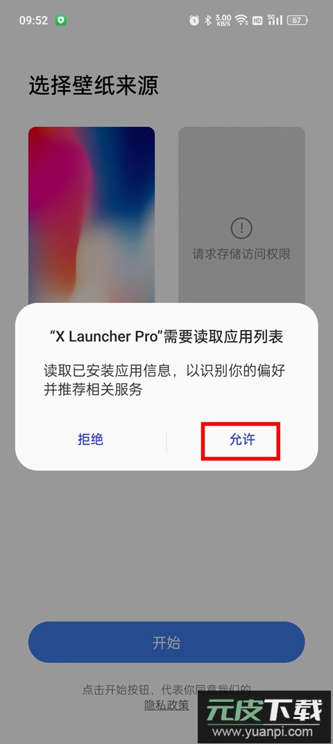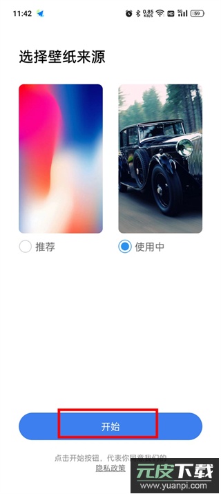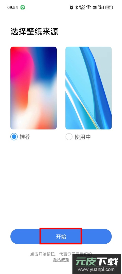 2、权限设置完成后,选择壁纸来源,推荐使用系统推荐选项,点击底部开始按钮进入桌面;