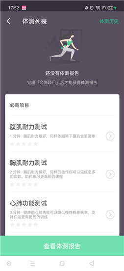 3、最后,在个人中心选择【身体测试】,点击体测列表下方的【查看体测报告】即可。