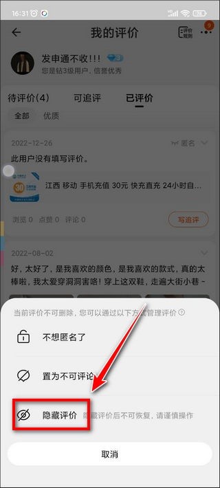 6、可选择隐藏评价,针对无法直接删除的评价,隐藏也能达到相同效果;
