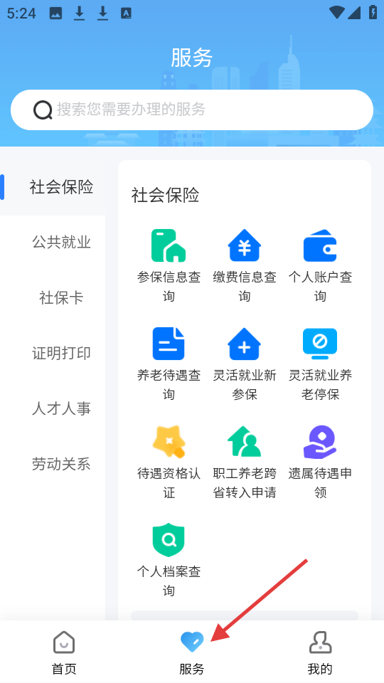 3、服务页面会展示各类服务入口,顶部设置搜索框,分类呈现社会保险、公共就业等相关服务,包含参保缴费等各类查询、办理事项;