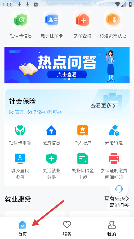 2、进入平台首页界面,会集成展示社保卡基础信息、参保查询等常用功能,还设置了热点问答区域,底部设有首页等导航栏方便跳转;