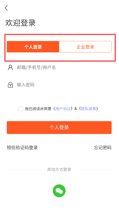 1、登录时选择个人或企业身份,不同登录方式对应不同用户界面,个人侧重求职,企业侧重招聘。