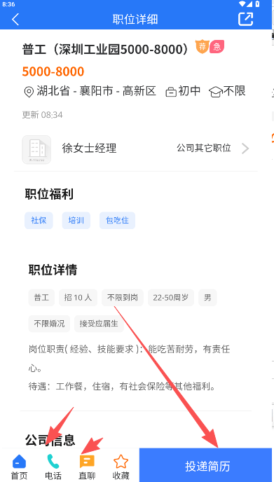 5、遇到感兴趣的公司职位,可收藏并投递简历;企业回复后,可选择在线沟通或电话联系进行后续洽谈,以确认岗位是否符合自身要求。