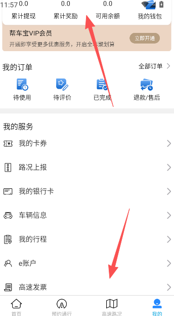 3、在我的页面中,可查看软件各项功能,包括卡券使用、车辆信息及行程记录等。