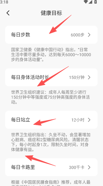 2、在此页面中,可对每日步数、身体活动时长、站立次数及卡路里消耗目标进行个性化设定。