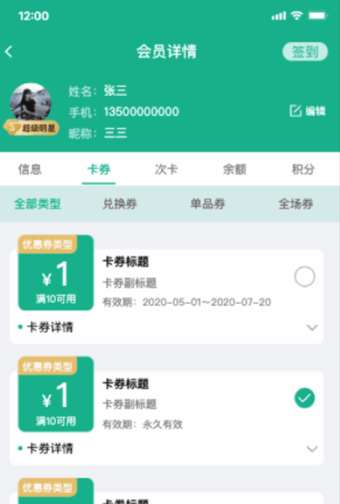 支持会员单品券、全场券、礼品兑换券及次卡的快速核销;同时兼容微信支付券功能。
