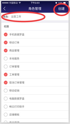 3、填写新角色的名称,根据需要勾选对应的权限范围,最后点击右上角“创建”按钮保存设置。