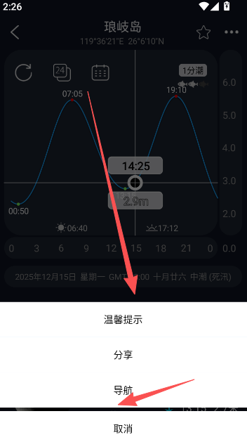 3、若当前潮汐天气预报信息符合需求,可选择分享转发或通过导航前往目的地,以获取更精准的信息。