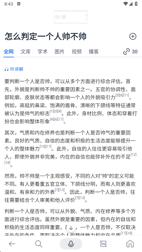 1、输入想要查询的内容,自由选择简洁、深入或研究等不同模式,同时可限定搜索范围,如全网、文库、学术、图片或博客等,从而获取更精准的信息;