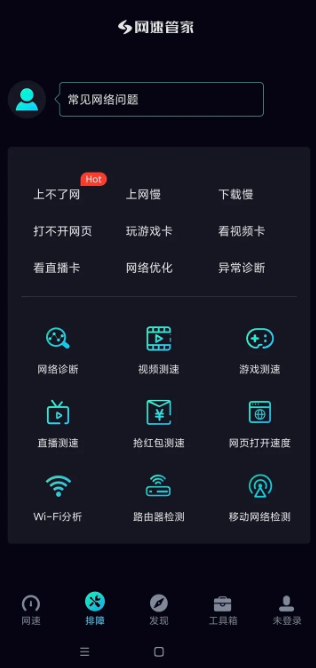 1. 在网速管家极速版中,点击排障功能,常见网络问题几乎都能在此找到解答。