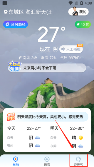 1、从当快下载安装软件后,点击页面下方的查天气按钮;