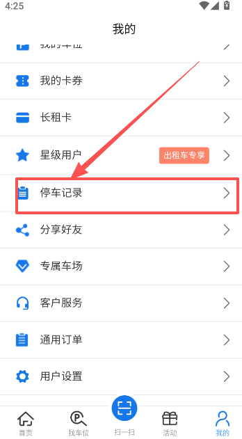1、在软件界面下滑,找到“停车记录”功能入口。