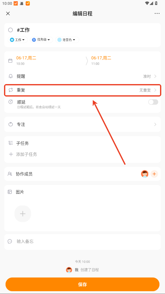 3、为任务设定提醒时间,避免忘记重要安排;可选择单次提醒或按周期重复提醒。