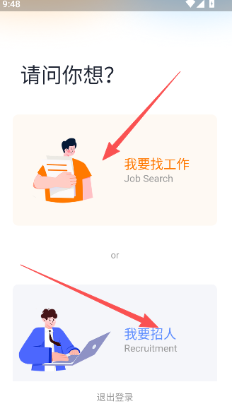 2、确认你的用户身份,选择求职者或招聘者角色。