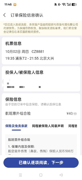 4、选择适合出行需求的航班,下单前仔细核对订单与保险信息,确认无误后点击“下一步”。
