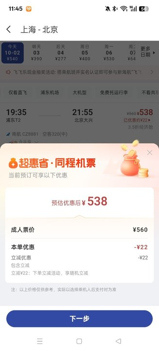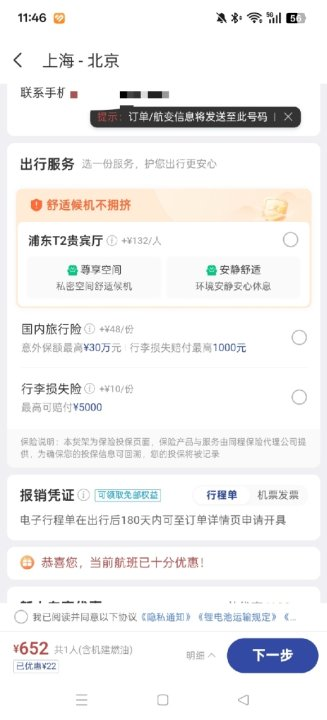 5、国庆中秋等节日期间,平台会推出多项出行福利,系统将自动匹配该航班可用的优惠,用户直接完成支付即可。