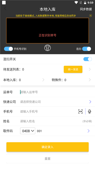 3、跳转至本地入库页面后,扫描识别快递单号即可完成入库操作;