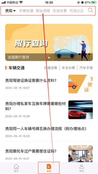 3、点击指南板块,就能进入所在城市的专属办事指南页面,包含公积金、户籍身份、社保、车辆交通、教育资讯等各类民生办事类实用信息;