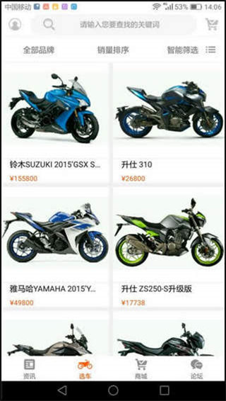 2、直接点击页面上的选车板块,就可以筛选自己心仪的帅气摩托;