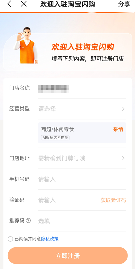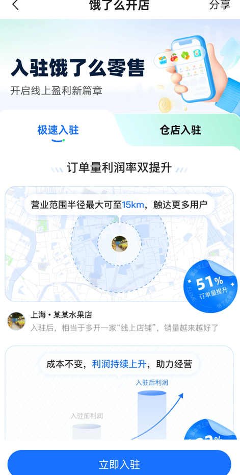 3、确定门店类型后,点击“立即入驻”进入资料提交环节。