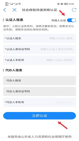 5、若需要为其他人员办理认证,选择“为他人进行认证”选项,按照页面提示填写对应人员信息后再进行认证操作;