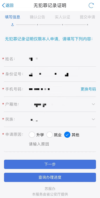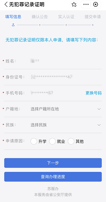 根据页面提示填写相关信息,进入下一步操作,仔细阅读无犯罪记录证明申报须知;