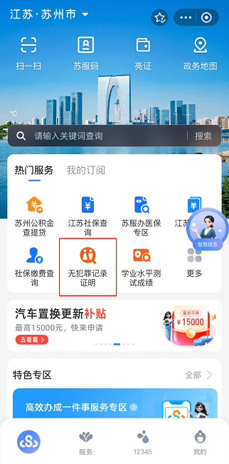 登录苏服办应用后,在首页搜索栏输入“无犯罪记录证明”进入服务页面;