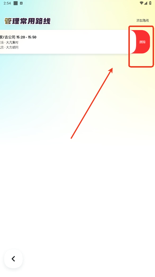3、在常用路线列表中,按住某条路线向左滑动,点击出现的删除按钮即可移除。