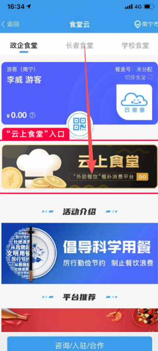 1、打开“云上食堂”应用,在首页点击“食堂云”入口。