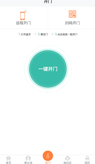 1、打开手机蓝牙功能,在门附近点击“一键开门”按钮或摇动手机即可开门。