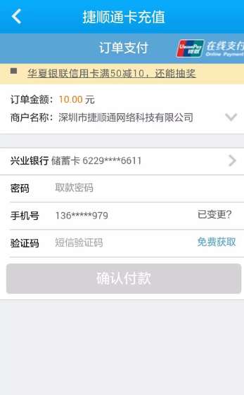 4、输入银行卡号、密码,获取短信验证码后点击“确认付款”;