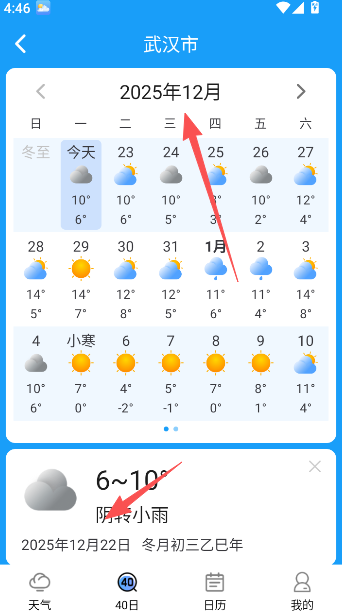 3、通过“40日预报”功能,查询当前城市未来40天的气象情况,便于规划长期出行。