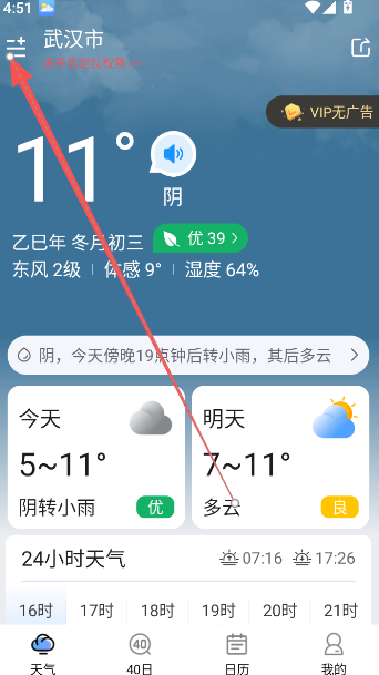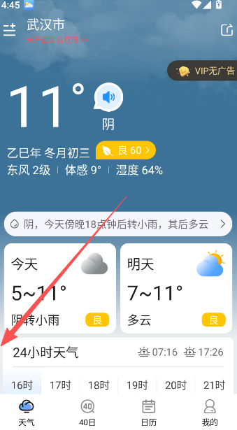 2、进入首页后,可查看当天及次日的天气详情。
