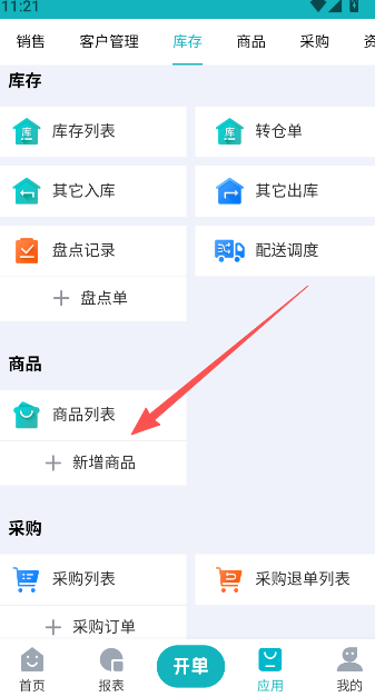 1、进入应用页面后向下滑动,找到商品详情板块,点击新增商品按钮。