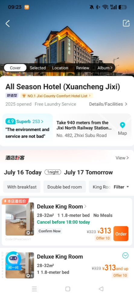 3、查看酒店信息并选择房型:浏览列表中的酒店,点击可查看详情,包括价格、设施、住客评价与地理位置。