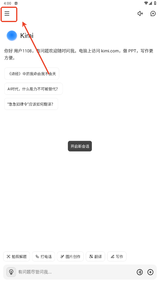 1、首先打开手机上的Kimi应用。