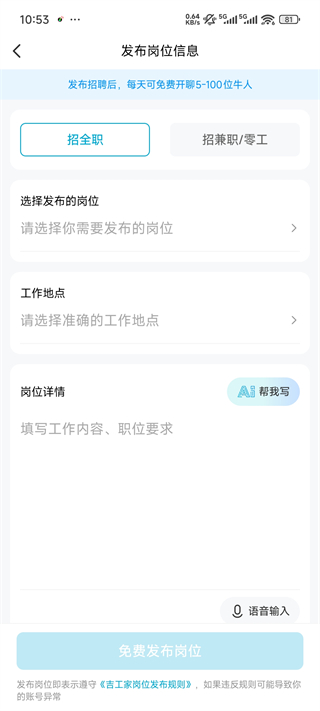 5、选定需要发布的岗位类型、工作地点与具体内容,点击发布即可完成操作