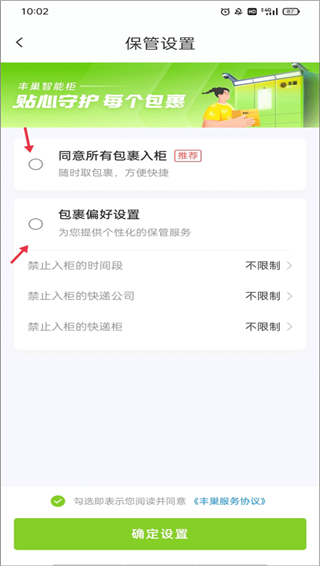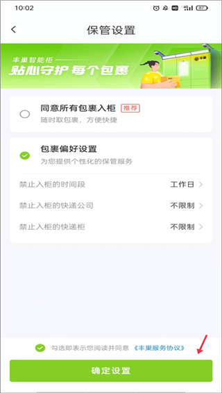 3、你可以在包裹偏好设置中勾选你要禁止入柜的时间段、快递公司、快递柜等,最后勾选服务协议,点击“确定设置”就完成操作。
