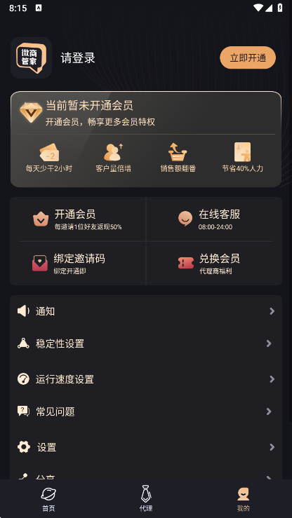 2. 首页集中展示了微商管家的各项核心功能入口;