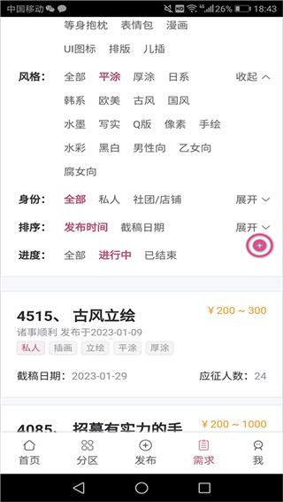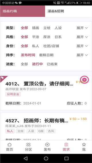 2、按需选择约稿的类型、风格等筛选项,选定后下方页面会自动刷新,展示符合要求的约稿需求